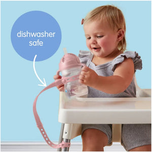 - Attaches to sippy cups and drink bottles to keep them within reach and off the floor