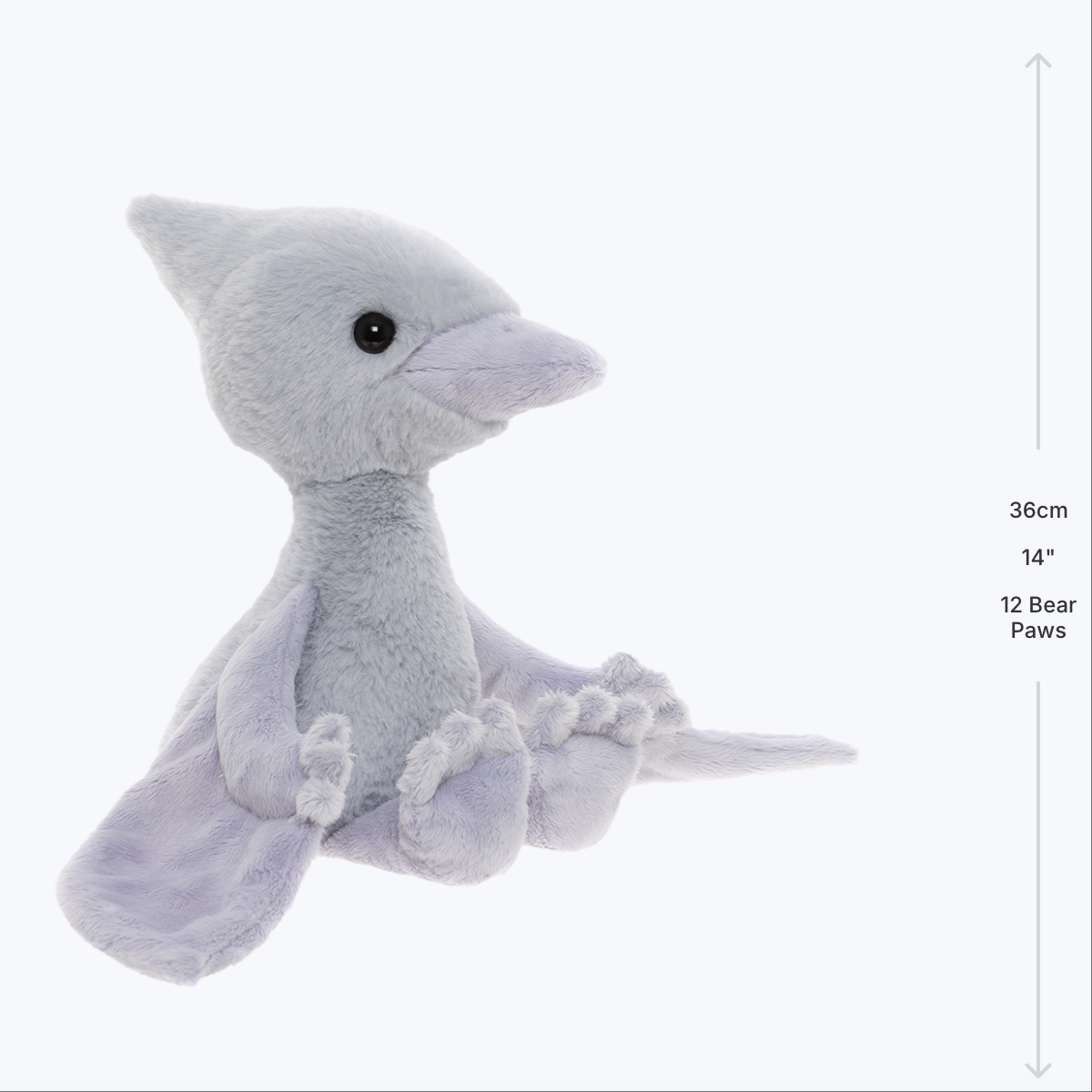 Wings Pterodactyl is a prehistoric charmer who’s traded the skies for snuggles. With a cloudy grey coat and soft, huggable body, this dinosaur buddy is all about comfort and play. Wings brings a little magic from the past into the present, making story time and cuddle time even more fun. Perfect for children and collectors who love characters with personality.