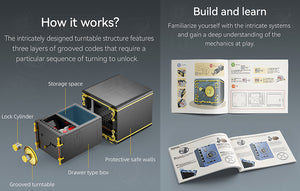 Inside the assembled safe lies a secret storage compartment, perfect for hiding small treasures, notes, or collectibles. More than just a building toy, it serves as a STEM learning tool: through hands-on construction and guided by retro "manuscript" instructions, users can explore gear systems and lock mechanisms. Its vintage brass-and-black color scheme also makes it a sleek desktop centerpiece or a fun prop for spy-themed setups, blending educational value with decorative appeal.