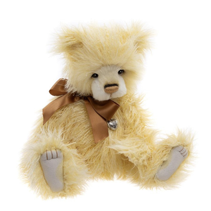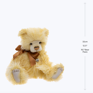 Banoffee Pie is sumptuously soft, yellow plush bear, as irresistible and comforting as your favourite dessert. With a hand-embroidered nose which paw-fectly compliments his charming copper bow tied neatly around his neck, he’s full of delightful details. Around his neck, he also wears a beautifully crafted silver heart necklace, adding an extra touch of elegance. Don’t forget to meet the rest of his sweet bear family, Blueberry Pie and Keylime Pie!