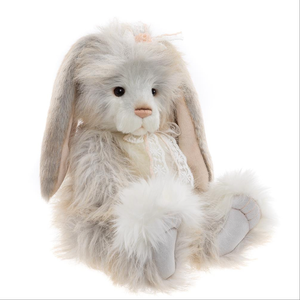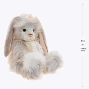 Meet Littlewood, a beautifully crafted bunny made from luxuriously soft white and grey plush, gently accented with delicate hints of pale honey. Her long and soft lop ears and oversized bunny feet, complete with tickly toe detailing make her irresistibly cuddly and full of character. Littlewood features apricot-hued inner ears and wears an elegant floral lace bow around her neck, finished with apricot trim. Her matching headpiece is adorned with a soft, peach-toned rose, adding a touch of vintage charm. Graceful and heart-warming, she's ready to hop straight into your arms, and your heart.