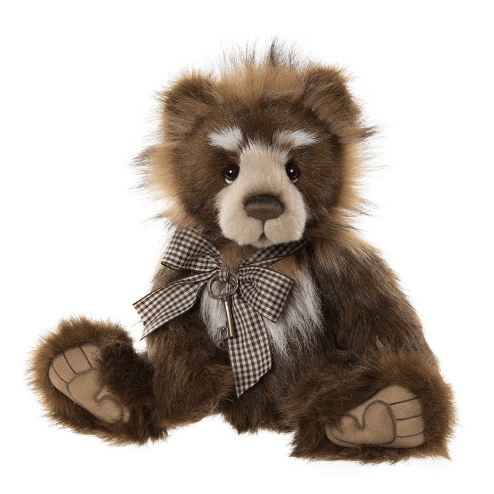 Charlie Bears Ray is a bear-utiful bear made from mid-long length plush in a traditional brown colour pallete. His nose, mouth and tickly toe detailing that you see upon his sculptured paws are all hand embroidered. Ray is wearing a checked ribbon which has been tied into a bow and is holding a key to your heart pendant. Look out for the other members of this bear family, Uncle Roy and Russell.