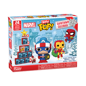 Count down to your favorite festive holiday—or any special occasion—with the Marvel 24-Day Bitty POP! Countdown Calendar! Open the tiny doors to reveal 10 Bitty POP! collectibles, 7 stackable display pieces, 3 holiday accessories, 2 keychain cases, and 2 pin cases. Expand your super hero lineup by making this Marvel 24-Day Bitty POP! Countdown Calendar the next addition to your collection.