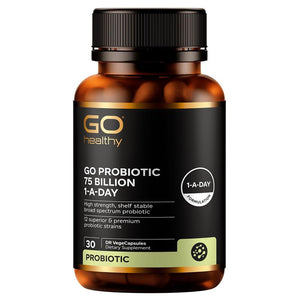 GO PROBIOTIC 75 BILLION offers a high strength, multi strained probiotic blend totalling 75 Billion live organisms, supplied in a convenient 1-A-Day dose. Each capsule provides a total of 12 superior and premium probiotic strains, including the scientifically researched HOWARU restore® probiotic blend. Supplied in a VegeCapsule using Delayed Release technology to ensure the probiotics survive the acidic stomach environment. GO Probiotic 75 Billion is designed to restore and maintain healthy gut microflora, providing support for digestive health, immunity and protection against antibiotic and long term medication use.