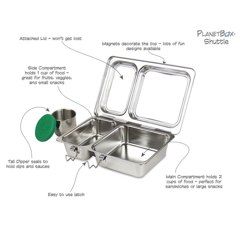 PlanetBox Shuttle Stainless Steel Lunch Box is designed for light meals and snacks on the go. It caters mainly to younger kids with small appetites, but we've found it's the perfect companion for day trips to the beach, road trips, hikes and other adventures. For those days you need a little energy pick-me-up, Shuttle is the true on-the-go Adventure box!