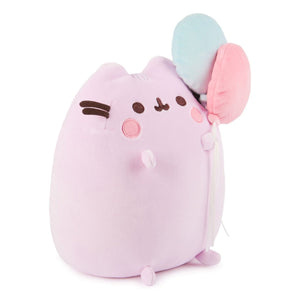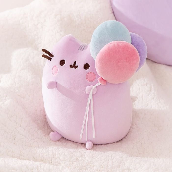 Celebrate 15 years with Pusheen! This adorable, irresistibly soft Squisheen features Pusheen holding a bundle of pastel balloons to celebrate her 15th birthday. This collectible plush features Pusheen standing upright in a display-ready pose, boasting velvety-soft, premium plush materials. Her pink plush is complemented by green, pink, and purple balloons with long white ribbons hanging downward. Pusheen's sweet smiling face features rosy embroidered cheeks, grey stripes on her back, and a pink and-grey striped tail in the rear.
