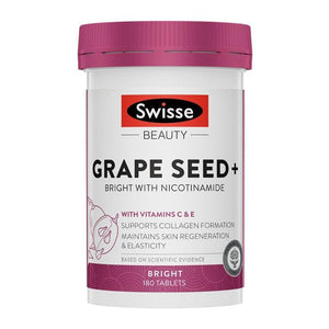 Swisse Beauty Grape Seed supports skin health by assisting with collagen production and providing antioxidant support. It also helps relieve symptoms associated with mild varicose veins.